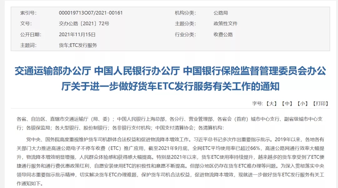 11月15日,交通運輸部辦公廳、中國人民銀行辦公廳、中國銀行保險監(jiān)督管理委員會辦公廳聯(lián)合發(fā)布《關(guān)于進一步做好貨車ETC發(fā)行服務(wù)有關(guān)工作的通知》: