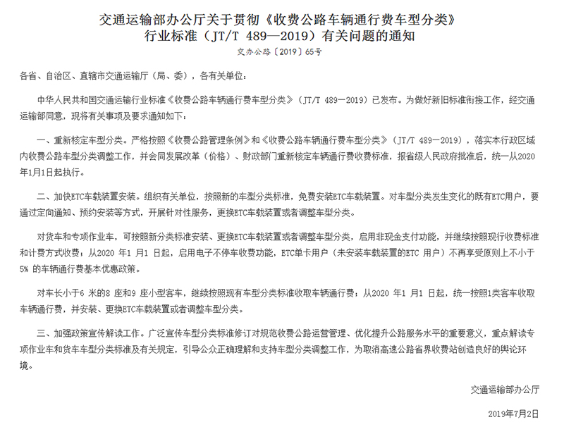 中華人民共和國(guó)交通運(yùn)輸行業(yè)標(biāo)準(zhǔn)《收費(fèi)公路車(chē)輛通行費(fèi)車(chē)型分類(lèi)》(JT/T 489—2019)已發(fā)布,落實(shí)本行政區(qū)域內(nèi)收費(fèi)公路車(chē)型分類(lèi)調(diào)整工作,并會(huì)同發(fā)展改革(價(jià)格)、財(cái)政部門(mén)重新核定車(chē)輛通行費(fèi)收費(fèi)標(biāo)準(zhǔn),報(bào)省級(jí)人民政府批準(zhǔn)后,統(tǒng)一從2020 年1月1日起執(zhí)行。