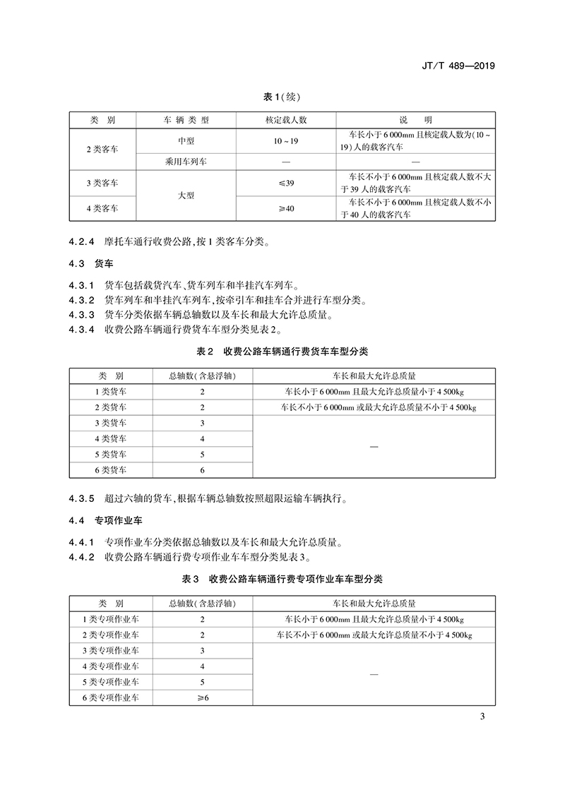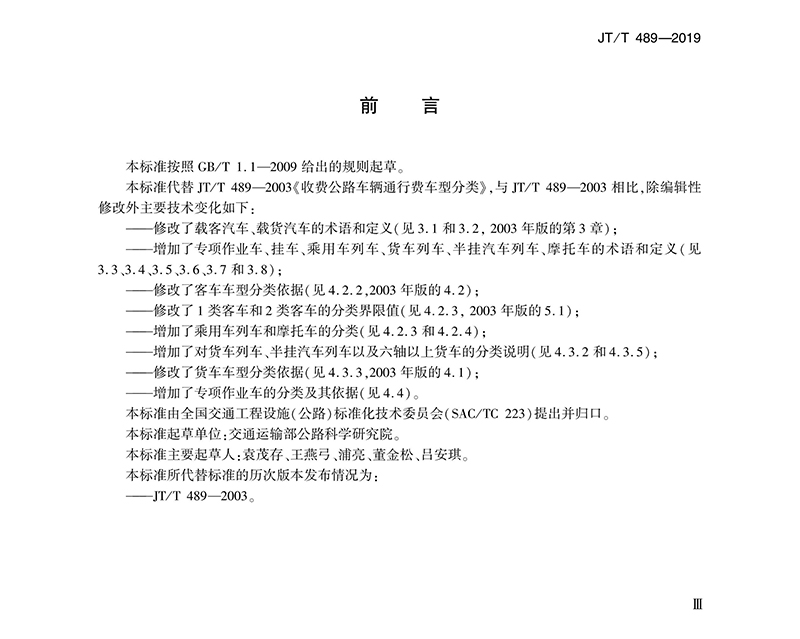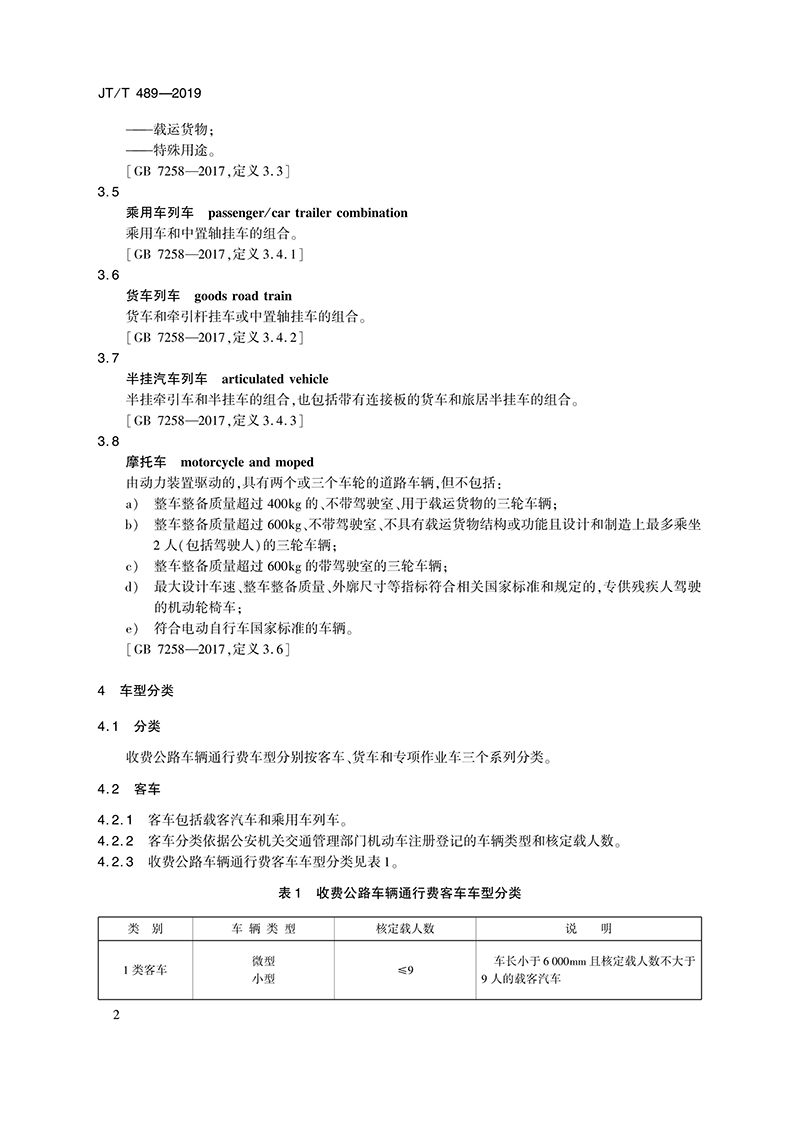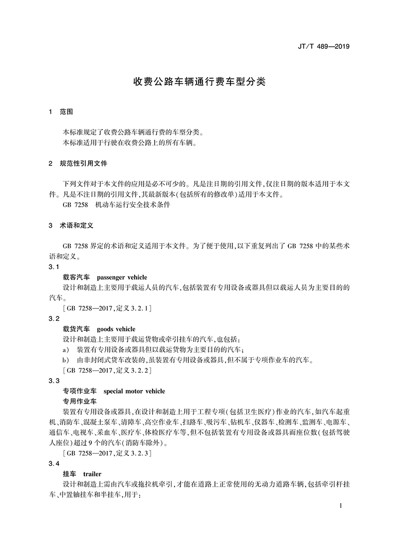 交通運(yùn)輸行業(yè)標(biāo)準(zhǔn)《收費(fèi)公路車(chē)輛通行費(fèi)車(chē)型分類(lèi)》 JT/T 489-2019
