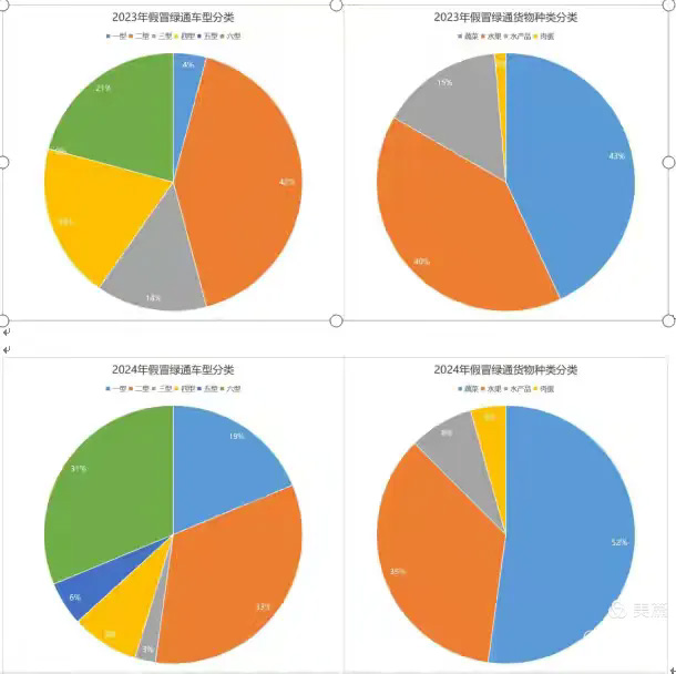 3.自集團(tuán)“綠色通道”車輛專項(xiàng)治理工作要求以來,鄭庵收費(fèi)站精細(xì)化梳理排查假冒綠通類別,針對(duì)性強(qiáng)化查驗(yàn)。假冒綠通車型和貨物種類分類如圖: