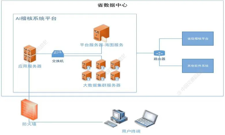 數(shù)據(jù)源是開(kāi)展收費(fèi)稽核工作的基礎(chǔ),包括通行、交易、牌識(shí)、視頻等采集數(shù)據(jù)和車輛發(fā)行、路網(wǎng)、費(fèi)率、節(jié)點(diǎn)等基礎(chǔ)數(shù)據(jù),具體如下[8]。1、車道收費(fèi)數(shù)據(jù)具體包括車道收費(fèi)交易數(shù)據(jù)和車道牌識(shí)數(shù)據(jù),其中車道收費(fèi)交易數(shù)據(jù)包括出入口站點(diǎn)、出入口時(shí)間、車牌、車型、軸重、軸數(shù)、行駛里程、收費(fèi)金額等;車道收費(fèi)牌識(shí)數(shù)據(jù)包括收費(fèi)站編號(hào)、抓拍時(shí)間、識(shí)別車牌號(hào)、識(shí)別車型、抓拍圖片等。2、門架計(jì)費(fèi)數(shù)據(jù)和牌識(shí)數(shù)據(jù)具體包括門架計(jì)費(fèi)交易數(shù)據(jù)和門架牌識(shí)數(shù)據(jù),其中,門架計(jì)費(fèi)交易數(shù)據(jù)包括入口信息、交易時(shí)間、車型、車牌、計(jì)費(fèi)里程、計(jì)費(fèi)金額等;門架牌識(shí)數(shù)據(jù)包括門架編號(hào)、抓拍時(shí)間、識(shí)別車牌號(hào)、識(shí)別車型、拍攝位置、抓拍圖片等。3、發(fā)行數(shù)據(jù)包括ETC和OBU的發(fā)行數(shù)據(jù),具體包括發(fā)行省份、發(fā)行時(shí)間、車牌、車型、顏色、圖片、軸數(shù)以及辦理人的相關(guān)信息。4、跨省拆分?jǐn)?shù)據(jù)包括車輛跨省通行的車輛通行數(shù)據(jù)和收費(fèi)數(shù)據(jù),具體包括車輛通行收費(fèi)站出入口數(shù)據(jù)、車道交易數(shù)據(jù)、門架計(jì)費(fèi)數(shù)據(jù)等信息。5、全省治超數(shù)據(jù)和治超牌識(shí)數(shù)據(jù)主要包括車輛通行數(shù)據(jù)、計(jì)重?cái)?shù)據(jù)和牌識(shí)數(shù)據(jù),具體包括車輛通行時(shí)間、車牌、車型、軸重、軸型、圖片等數(shù)據(jù)。(二) AI稽核系統(tǒng)設(shè)計(jì)思路1、AI稽核網(wǎng)絡(luò)拓?fù)銩I稽核系統(tǒng)采用了大數(shù)據(jù)集群服務(wù)器、地圖引擎服務(wù)器、應(yīng)用服務(wù)器,網(wǎng)絡(luò)拓?fù)淙鐖D2所示。其中,大數(shù)據(jù)集群服務(wù)器主要對(duì)收費(fèi)數(shù)據(jù)、發(fā)行數(shù)據(jù)、拆分?jǐn)?shù)據(jù)、治超數(shù)據(jù)、牌識(shí)數(shù)據(jù)接收、存儲(chǔ)以及對(duì)稽核模型、路徑還原等進(jìn)行計(jì)算,還能通過(guò)倒排索引對(duì)數(shù)據(jù)進(jìn)行高性能檢索;地圖引擎服務(wù)器主要實(shí)現(xiàn)地圖圖層加載、路網(wǎng)模型計(jì)算;應(yīng)用服務(wù)器主要實(shí)現(xiàn)對(duì)AI稽核系統(tǒng)的部署和接口的數(shù)據(jù)交互。