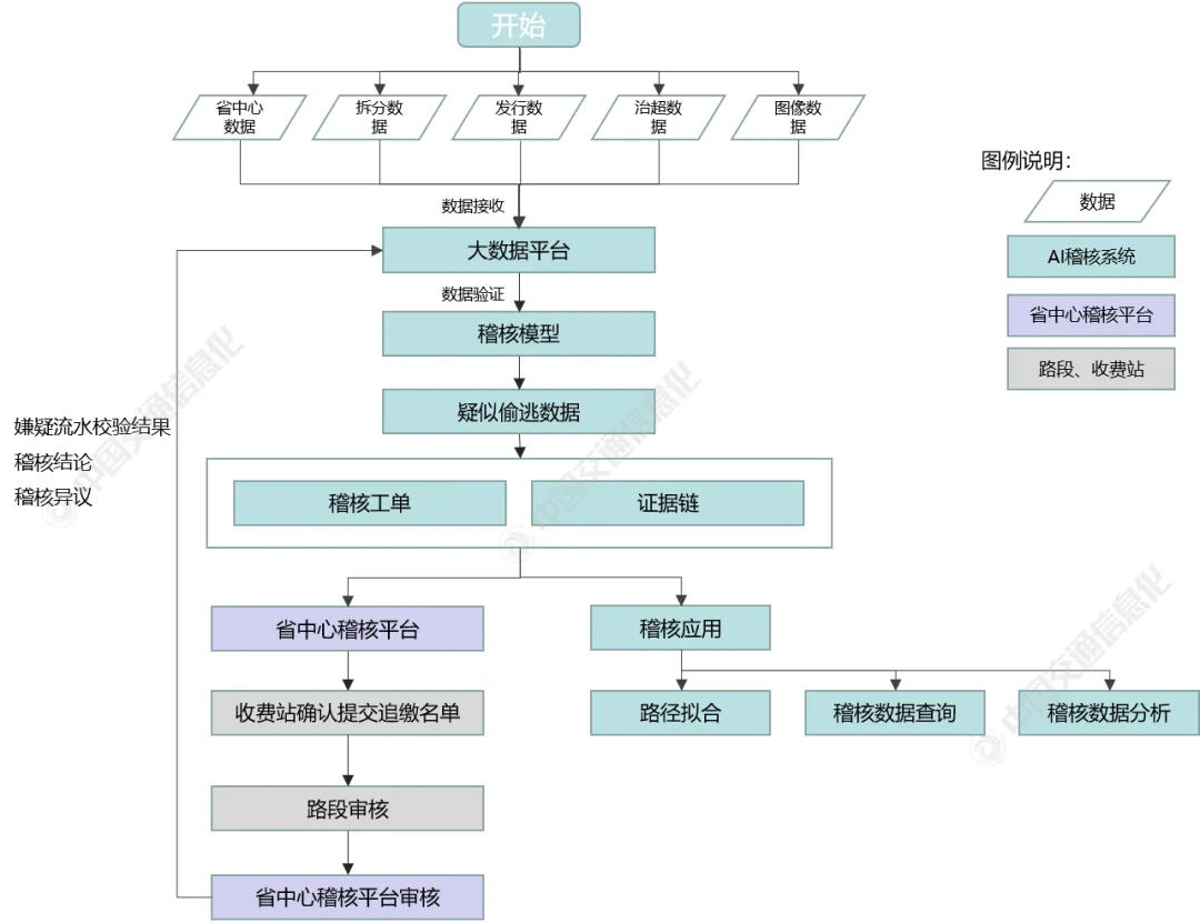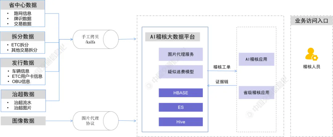 同時(shí),鑒于數(shù)據(jù)存儲(chǔ)介質(zhì)、數(shù)據(jù)存儲(chǔ)類型和數(shù)據(jù)傳輸方式的差異,通過(guò)不同工具實(shí)現(xiàn)異源、異構(gòu)數(shù)據(jù)的導(dǎo)入。其中,對(duì)實(shí)時(shí)性要求較高的監(jiān)測(cè)數(shù)據(jù)以分布式消息隊(duì)列的形式由Kafka分發(fā);關(guān)系型數(shù)據(jù)庫(kù)由Sqoop等工具直接將數(shù)據(jù)導(dǎo)入HDFS;非實(shí)時(shí)性數(shù)據(jù)選擇MapReduce計(jì)算引擎,實(shí)時(shí)性要求較高的數(shù)據(jù)選擇Spark或Storm計(jì)算框架。3、AI稽核系統(tǒng)流程AI稽核系統(tǒng)流程如圖4所示,可分為4個(gè)步驟:(1)省中心數(shù)據(jù)、拆分?jǐn)?shù)據(jù)、治超數(shù)據(jù)、發(fā)行數(shù)據(jù)等接收匯聚至大數(shù)據(jù)平臺(tái),通過(guò)稽核模型數(shù)據(jù)驗(yàn)證,得到疑似偷逃費(fèi)數(shù)據(jù);(2)系統(tǒng)根據(jù)疑似偷逃費(fèi)數(shù)據(jù),自動(dòng)匹配生成稽核工單和證據(jù)鏈,并推送至省中心稽核平臺(tái)及稽核應(yīng)用;(3)省中心稽核平臺(tái)將稽核工單和證據(jù)鏈推送至收費(fèi)站,一線稽核人員確認(rèn)后提交追繳工單,工單提交至路段和省中心進(jìn)行審核;(4)省中心稽核平臺(tái)審核完畢后,生成追繳名單,并反饋校驗(yàn)結(jié)果、稽核結(jié)論等至AI稽核系統(tǒng)。